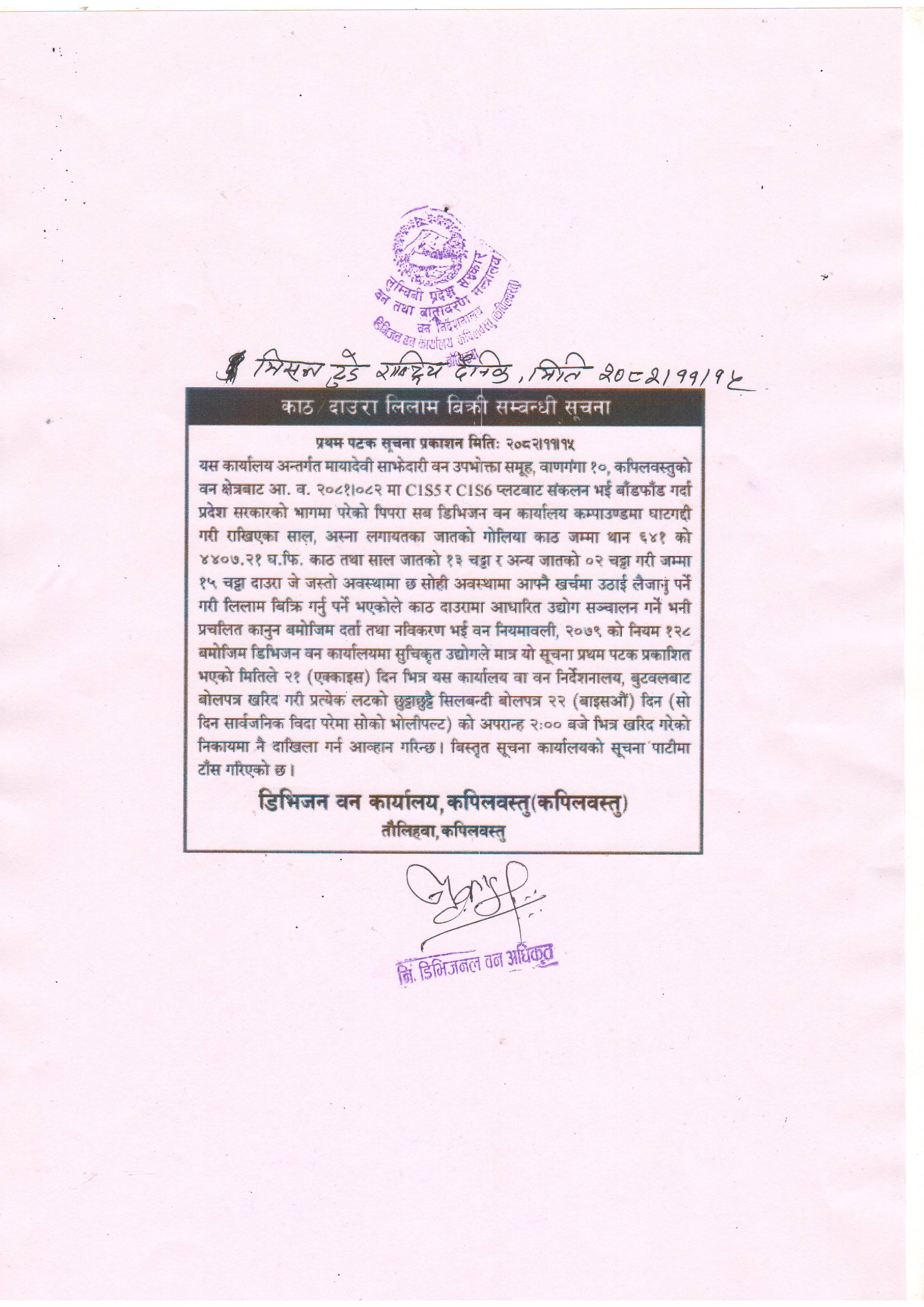मायादेवी साझेदारी वन उपभोक्ता समूह, बाणगङ्गा १०, कपिलवस्तुको काठ दाउरा लिलाम बिक्री सम्बन्धी सूचना ।