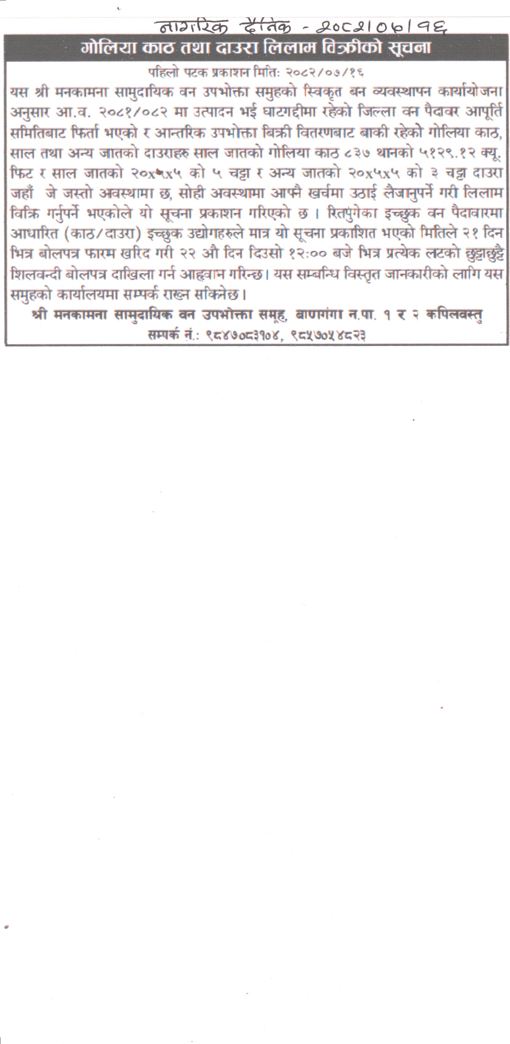 मनकामना सामुदायिक वन उपभोक्ता समूह, वाणगंगा न.पा. १ र ५ कपिलवस्तुको काठ दाउरा लिलाम बिक्रीको सूचना