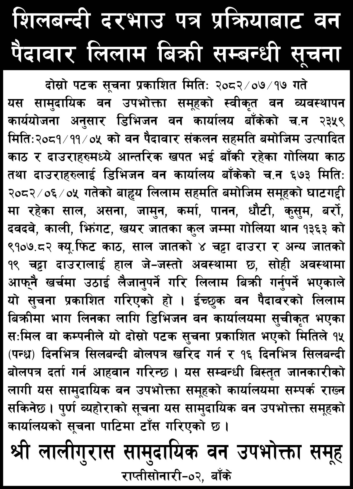 लालीगुरास सामुदायिक वन उपभोक्ता समूह राप्तीसोनारी २ बाँकेको काठ दाउरा लिलाम बिक्रीको सूचना