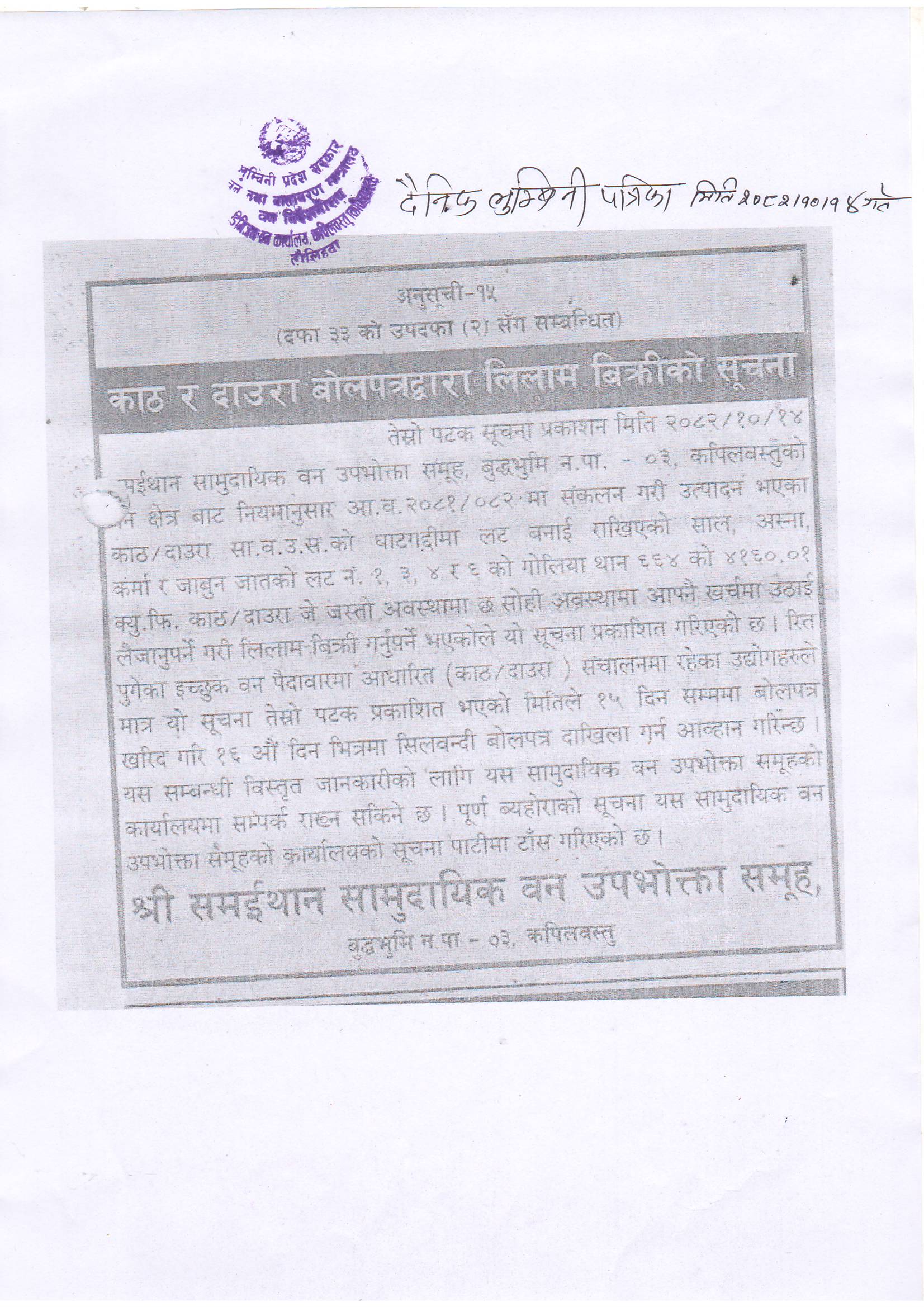 श्री समईथान सामुदायिक वन उपभोक्ता समूह, बुद्धभूमि न.पा.-०३, कपिलवस्तुको काठ र दाउरा बोलपत्रद्बारा लिलाम बिक्रीको सूचना