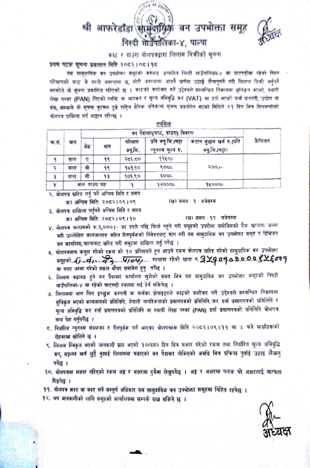 श्री आफरेडाँडा सामुदायिक वन उपभोक्ता समूह, निस्दी गाउँपालिका - ४, पाल्पाको काठ/दाउरा लिलाम बिक्रीको सूचना ।