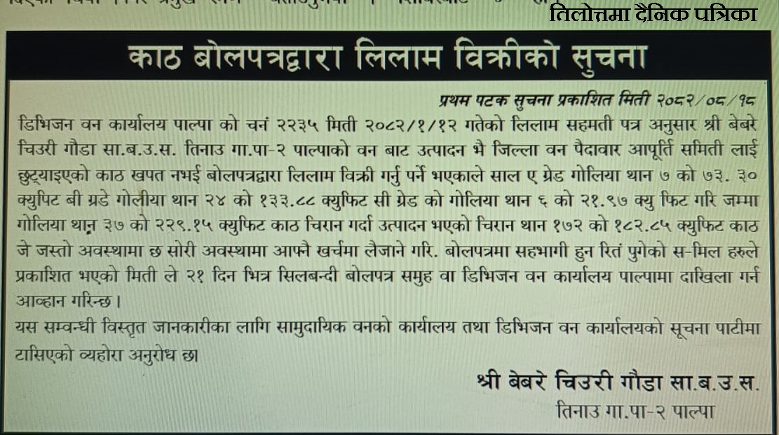 श्री बेवरे चिउरी गौडा सामुदायिक वन उपभोक्ता समूह तिनाउ गाउपालिका - २ पाल्पाको काठ लिलाम बिक्रीको सूचना