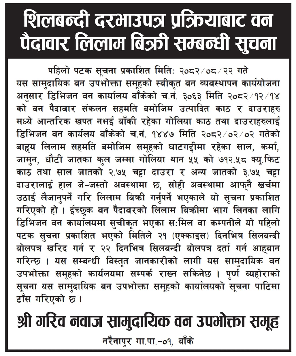 श्री गरिव नवाज सामुदायिक वन उपभोक्ता समूह नरैनापुर गा.पा. - ०१, बाँकेको काठ तथा दाउराको लिलाम बिक्रीको सूचना