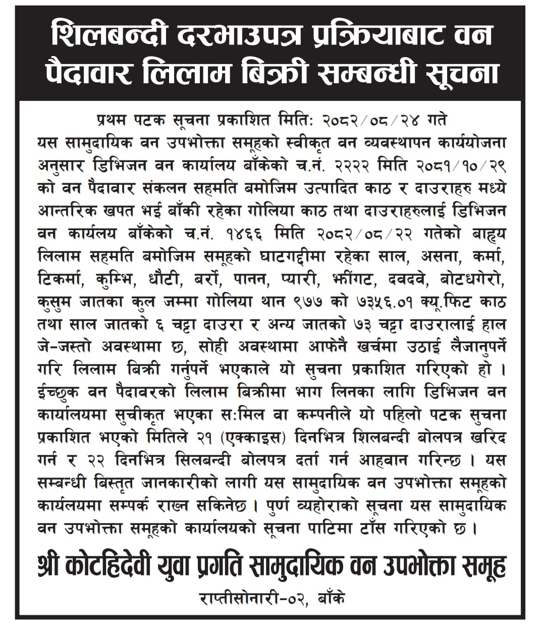 कोटहि देवी युवा प्रगति सा.व.उ.स, राप्तीसोनारी-२ बाँकेको गोलिया काठ तथा दाउरा लिलाम सम्बन्धि सूचना ।