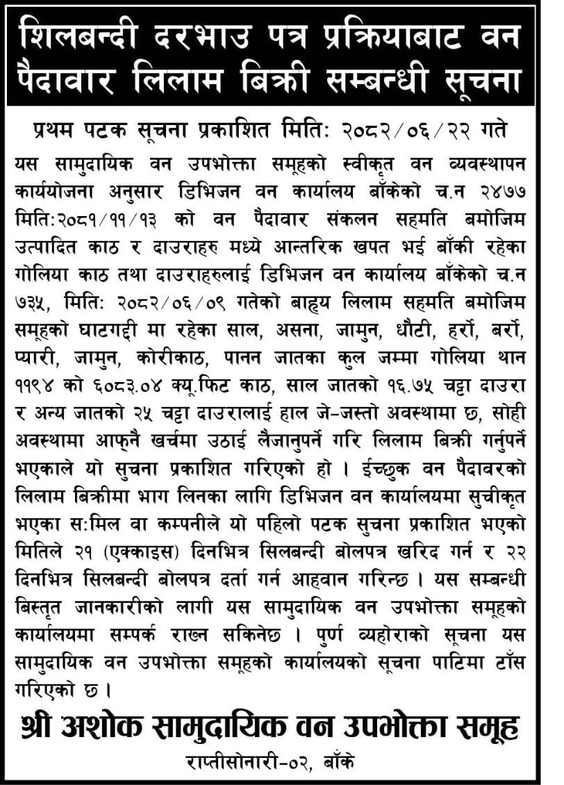 अशोक सामुदायिक वन उपभोक्ता समूह, राप्तीसोनारी-०२, बाँकेको काठ दाउरा लिलाम बिक्रीको सुचना