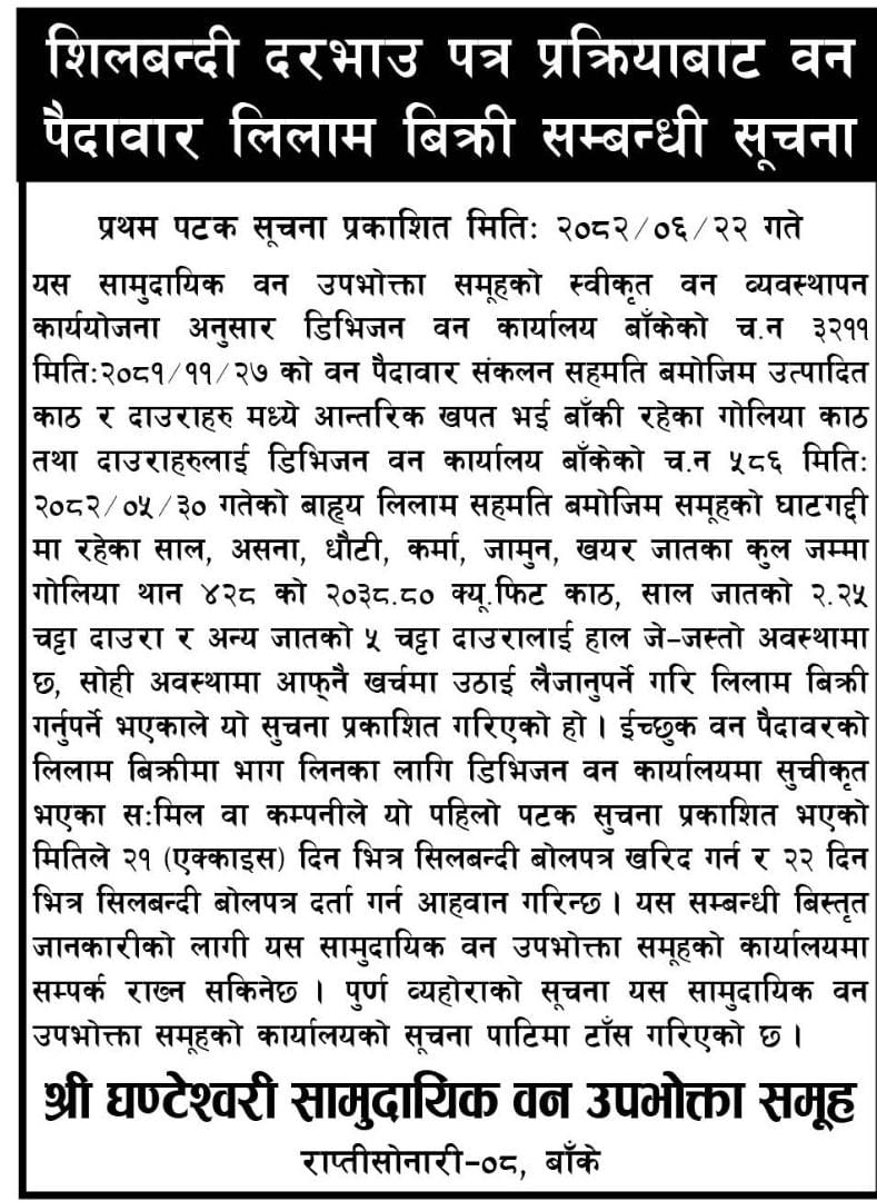 घण्टेश्वरी सामुदायिक वन उपभोक्ता समूह, राप्तीसोनारी-०८, बाँकेको काठ दाउरा लिलाम बिक्रीको सुचना