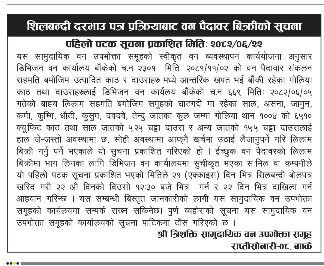 त्रिशक्ति सामुदायिक वन उपभोक्ता समूह, राप्तीसोनारी-०८, बाँकेको काठ दाउरा लिलाम बिक्रीको सुचना