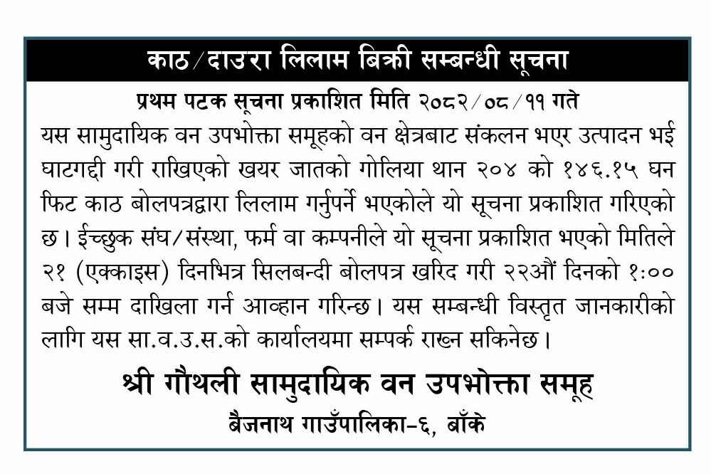 श्री गौथली सामुदायिक वन उपभोक्ता समूह बैजनाथ गाउँपालिका - ६, बाँकेको काठ/दाउरा लिलाम बिक्रीको सूचना ।