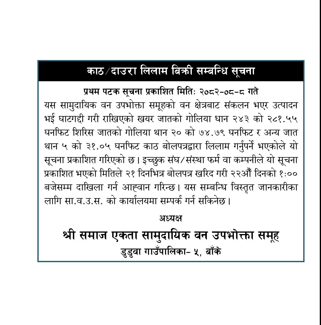 श्री समाज एकता सामुदायिक वन उपभोक्ता समूह डुडुवा गाउँपालिका - ५ बाँकेको काठ दाउरा लिलाम बिक्रीको सूचना