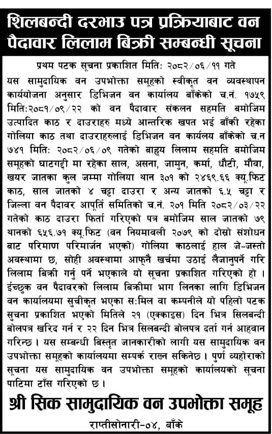 सिक सामुदायिक वन उपभोक्ता समूह, राप्तीसोनारी-०४, बाँकेको काठ दाउरा लिलाम बिक्रको सुचना