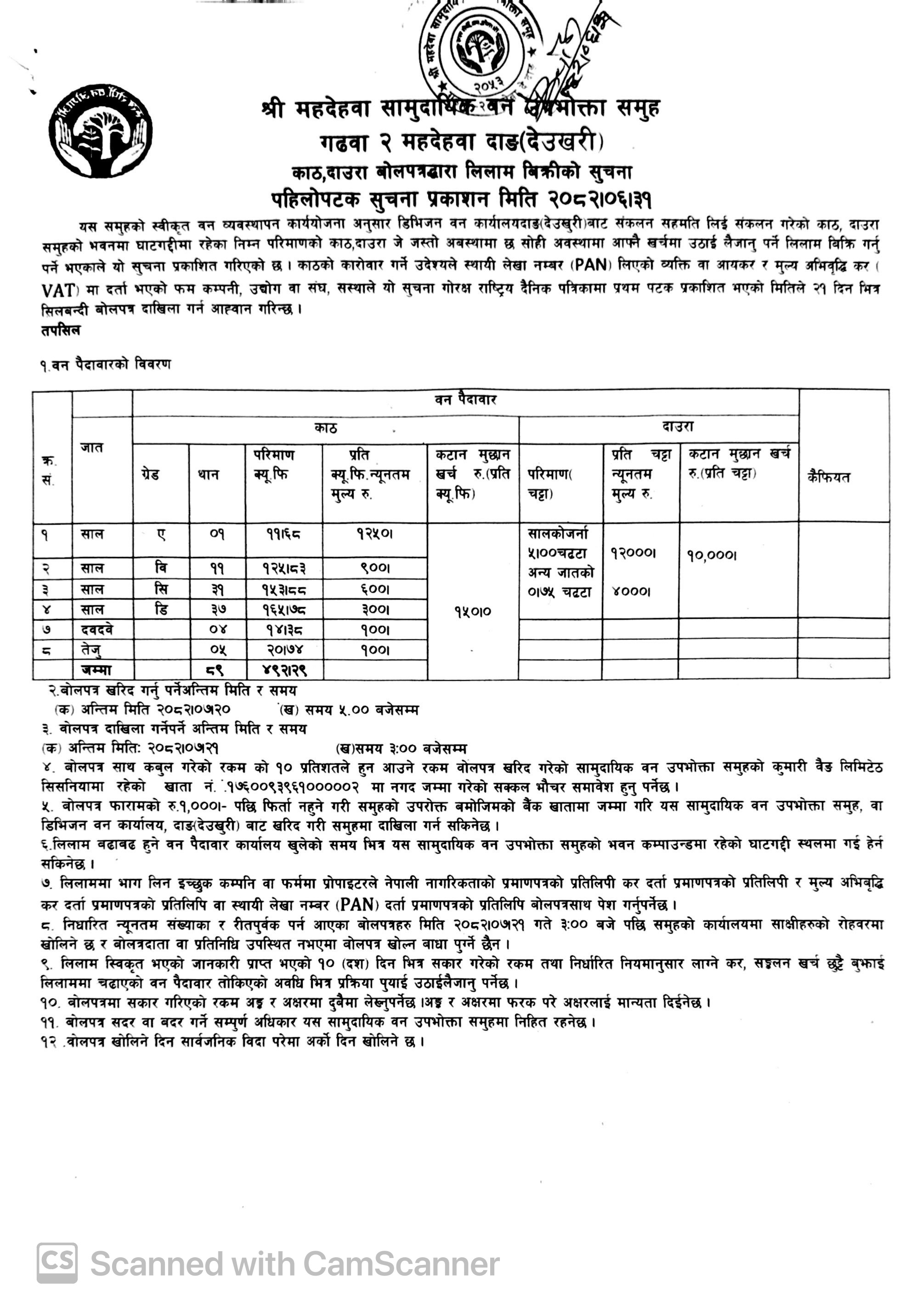 महदेहवा सामुदायिक वन उपभोक्ता समूह, गढवा-२, दाङको प्रथम पटक प्रकाशित काठ दाउरा लिलाम बिक्रीको सूचना