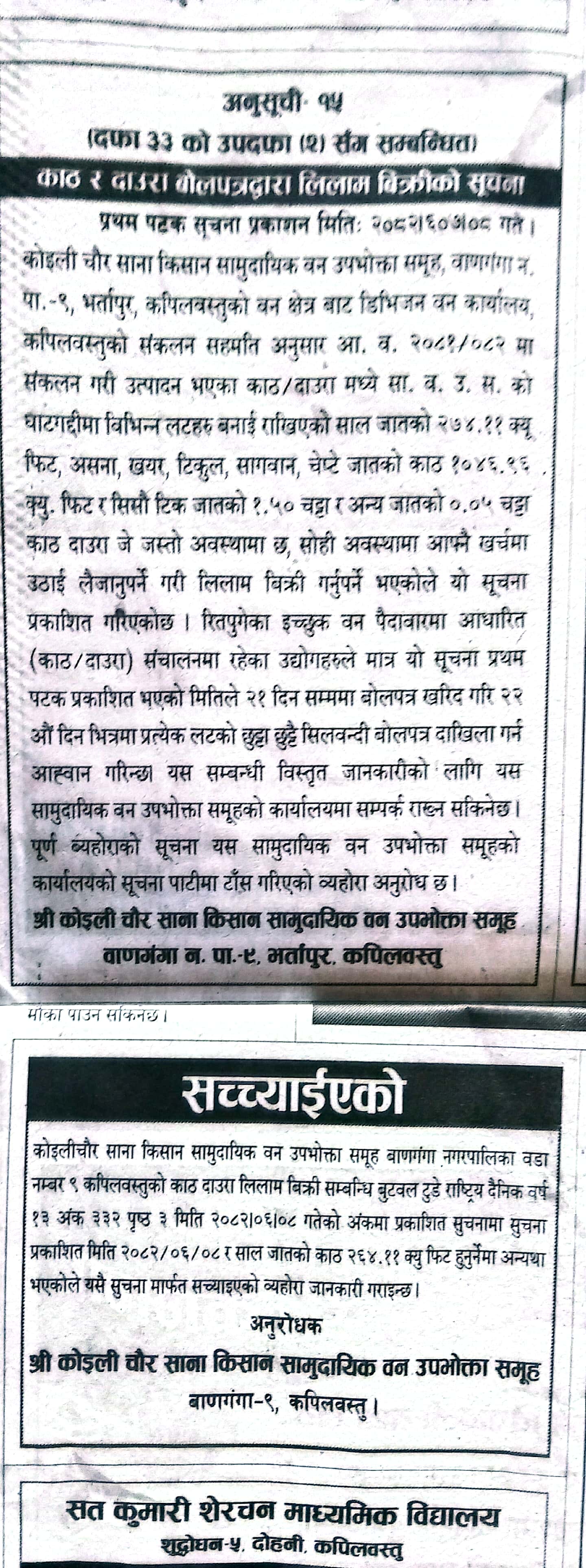 काेईलीचाैर सानाकिसान सामुदायिक वन उपभोक्ता समूह, वाणगंगा-९, कपिलवस्तुकाे काठ दाउरा लिलाम बिक्रीको सूचना तथा सच्चाइएको सूचना