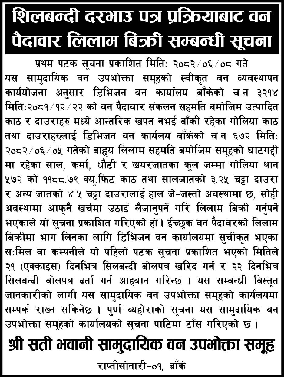 सती भवानी सामुदायिक वन उपभोक्ता समूह, राप्तीसोनारी-०१, बाँकेको काठ दाउरा लिलाम बिक्रीको सुचना