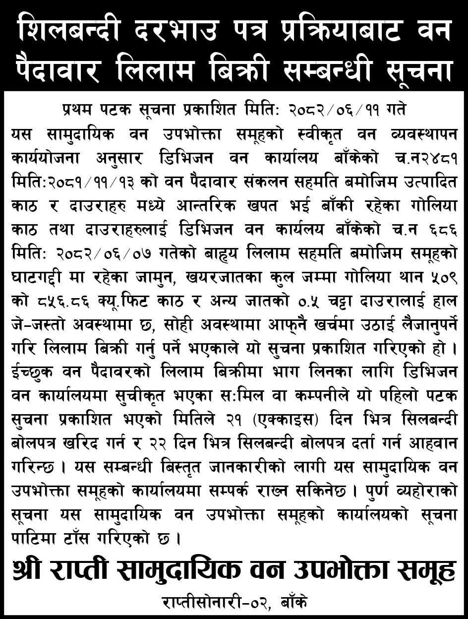 राप्ती सामुदायिक वन उपभोक्ता समूह, राप्तीसोनारी-०२, बाँकेको काठ दाउरा लिलाम बिक्रीको सुचना